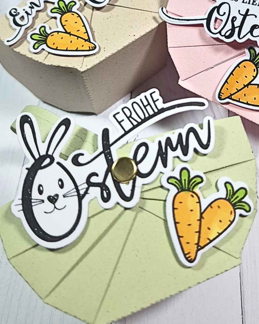 Kombiniere die Stanzen miteinander: Setze die Erdbeere in den Kranz oder arrangiere den Schriftzug mit weiteren Ostermotiven. Die herzförmige Möhren ist nicht nur zu Ostern ein Hingucker, sondern passt auch zu Frühlingskarten und Gartenthemen.