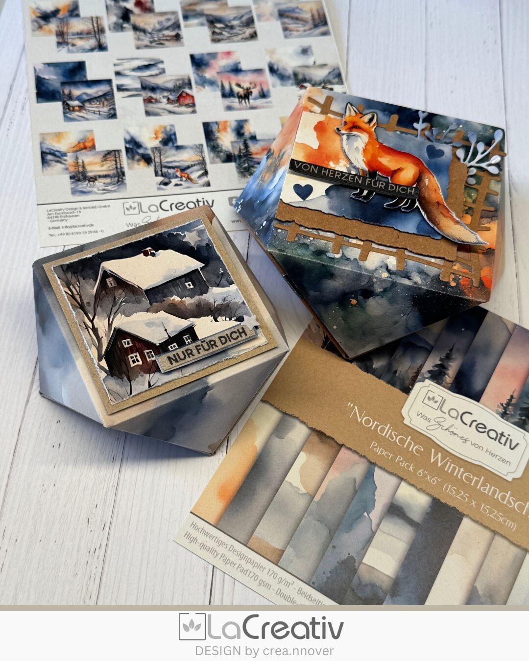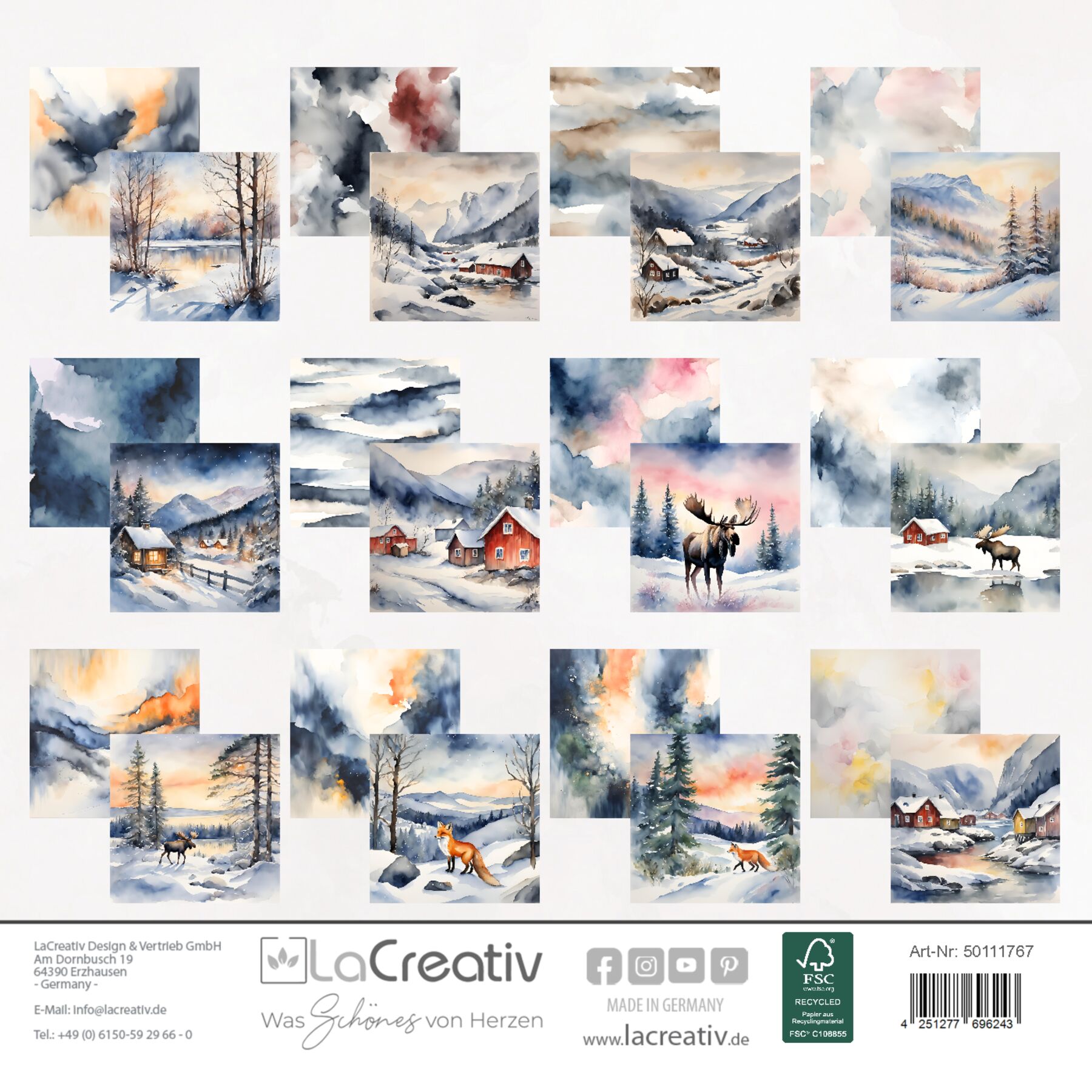 Dieses edle Designpapier-Set entführt dich in eine stille, verträumte Winterwelt voller nordischer Magie. Zarte Aquarell-Illustrationen von verschneiten Wäldern, Bergen und stimmungsvollen Himmeln verleihen deinen Bastelprojekten eine ruhige, elegante Atmosphäre. Die 24 beidseitig bedruckten Bögen auf hochwertigem Papier eignen sich ideal für stilvolle Weihnachtskarten, stimmungsvolle Scrapbook-Seiten, Geschenkverpackungen oder winterliche Dekorationen.