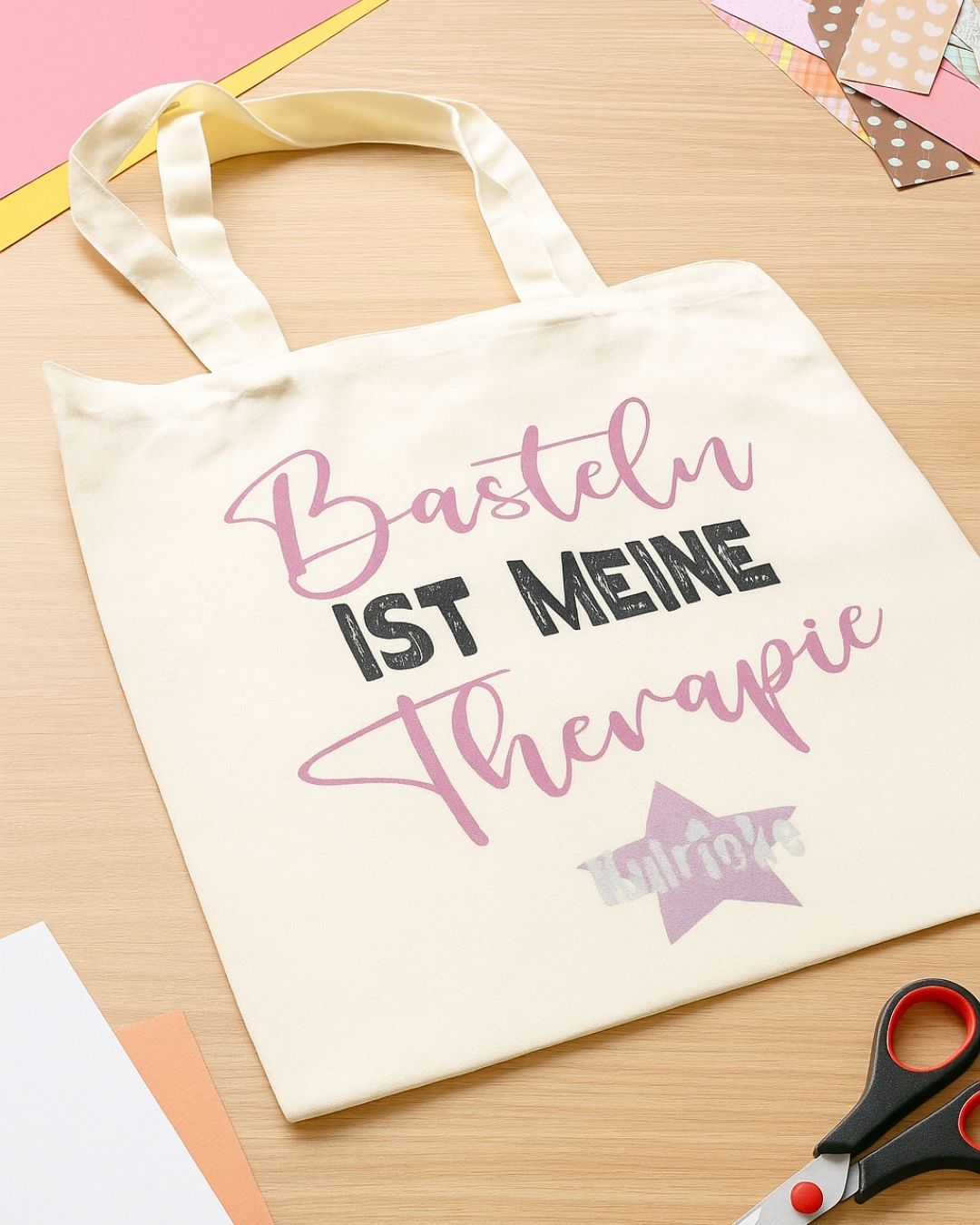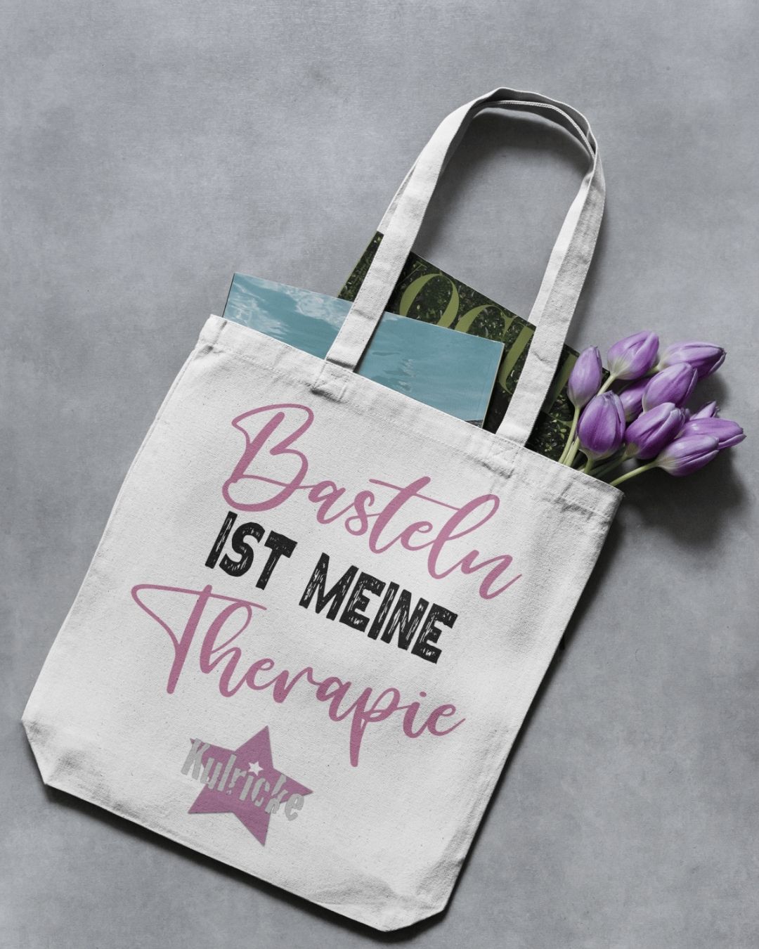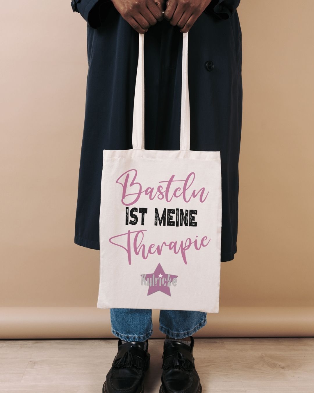 Der aufgedruckte Spruch "Basteln ist meine Therapie" macht deutlich, was deine Prioritäten sind und zaubert jedem, der ihn liest, ein Lächeln ins Gesicht. Ob du zum Bastelladen gehst, einen Workshop besuchst oder einfach nur deinen Alltag bestreitest – diese Tasche ist dein perfekter Begleiter, der deine Leidenschaft fürs Basteln widerspiegelt.