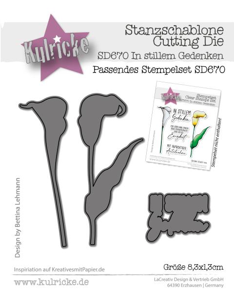 Stempelset SST670 entwickelt und ermöglicht ein präzises Stanzen des Schriftzuges "Stilles Gedenken". Zusätzlich können die beiden Callas / Blumen mit oder ohne Stempelabdruck gestanzt werden.