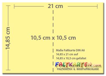 Unsere hochwertigen farbigen Faltkarten im Format DIN A6 aus 240 g/m² glatten FSC zertifizierten Karton sind von DIN A5 (14,85 x 21cm) auf DIN A6 (14,85 x 10,5cm) gefaltet und in vielen unterschiedlichen Farben verfügbar.